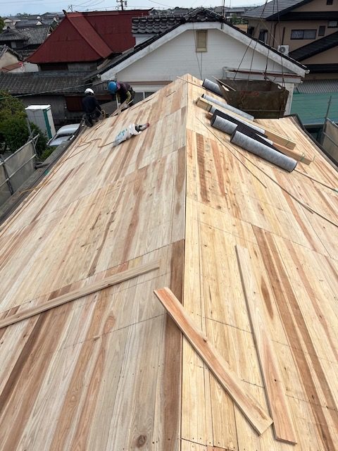 既存の野地板の上から新しい4分の野地板を重ね貼りしていきます