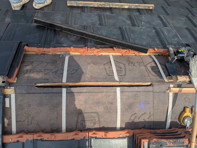 ルーフィングを貼り、縦桟テープ、桟木を取り付けます